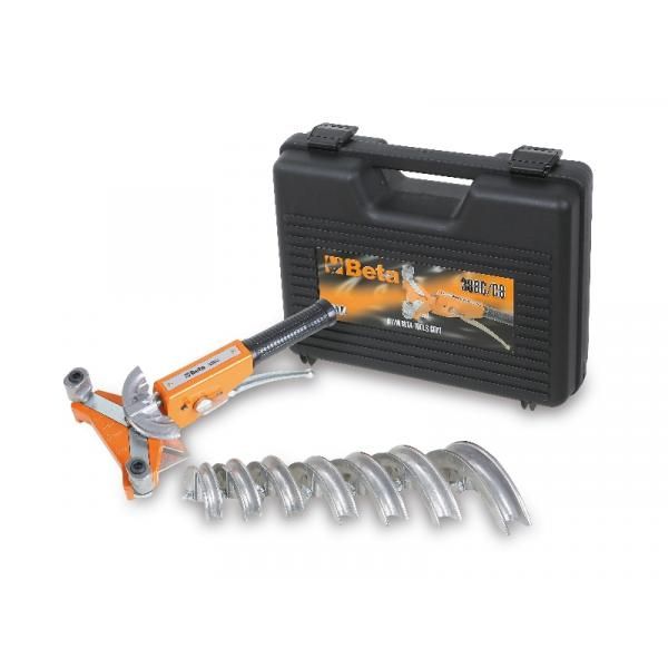 Attrezzo curvatubi con 7 matrici in alluminio per rame ricotto e lega leggera in cassetta di plastica.