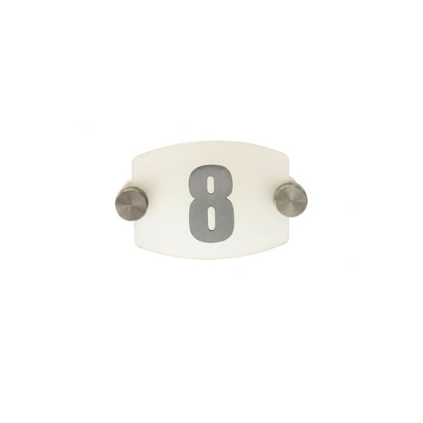 Placca in Plexiglass satinato con supporti in acciaio inox 1 numero è una targa per numero civico di design, realizzata in Plexiglass satinato (acrilico con effetto opaco/sabbiato) e fissata tramite distanziali in acciaio inox.