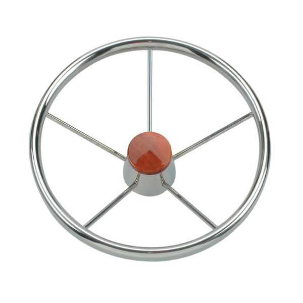 Volante in acciaio inox a 5 razze, cono universale, impugnatura a sezione ovale.